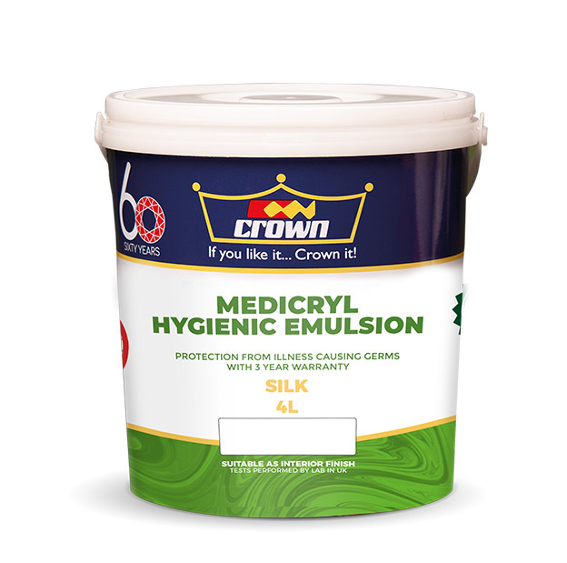 Crown Medicryl Silk Emulsion is a premium quality Anti-Bacterial waterborne paint which provides a subdued sheen level. It has fast drying, low odour qualities and ensures ease of application in public areas.